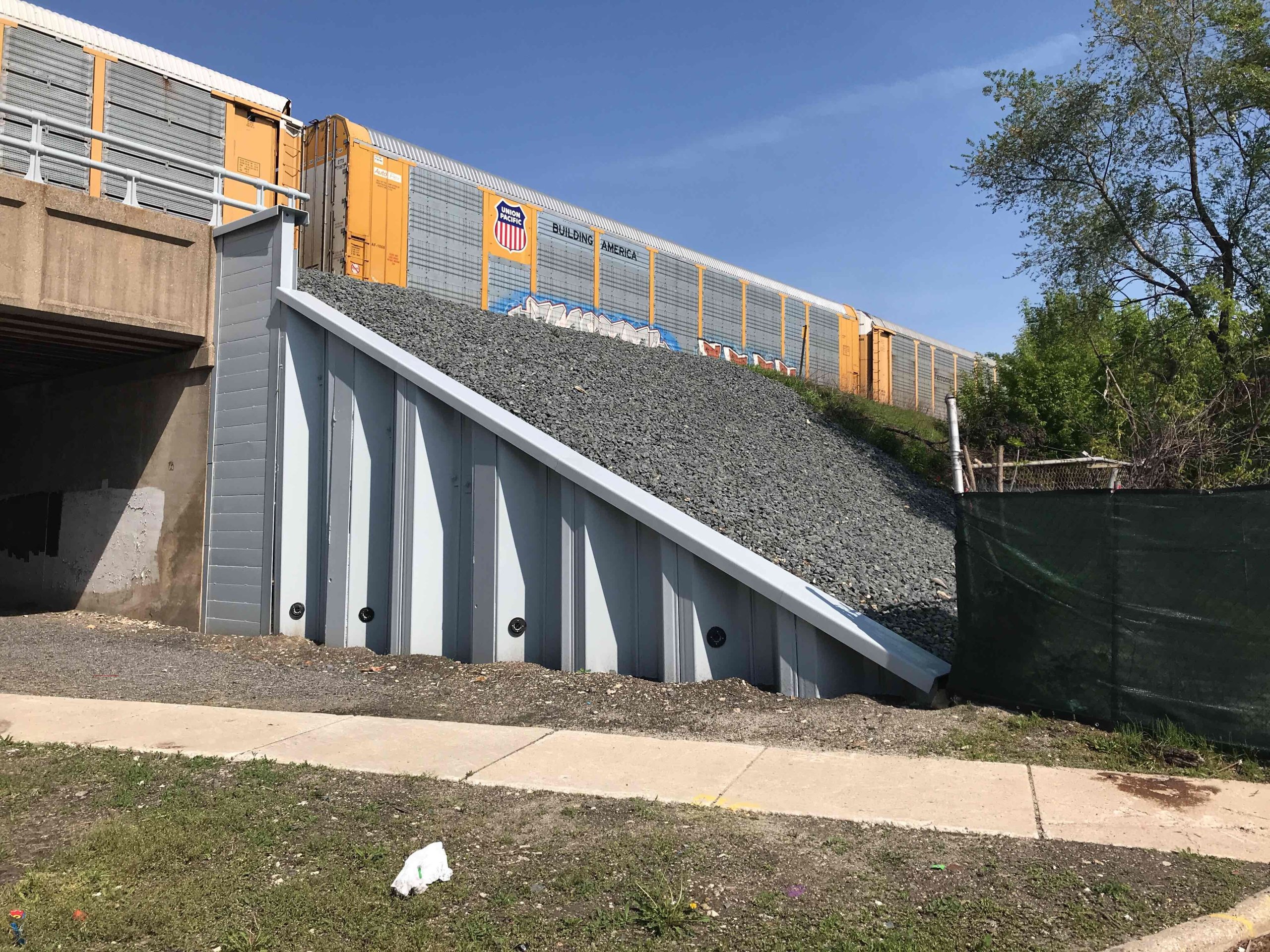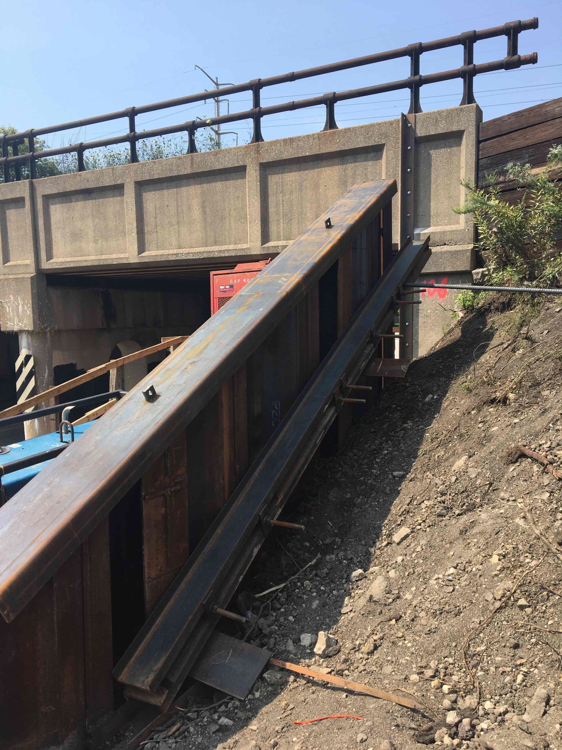 After the bridge work was completed IHB contracted Stalworth to return and install jacking and boring pits for excavations up to 12-feet deep with one level of bracing. Earth retention solutions were also requested for multiple other locations. We installed sheet piling on both ends of an abutment on School Street for an 8' excavation. Sheet piling was also installed on both end of an additional abutment and capped to be left exposed supporting the sloped grading going forward. One last additional system was constructed to support the grading down from the Washington Bridge. In this scenario the sheeting was also left exposed, painted and capped. Tierods were installed to a deadman system at this location to support the additional surcharge from the rail tracks supported.