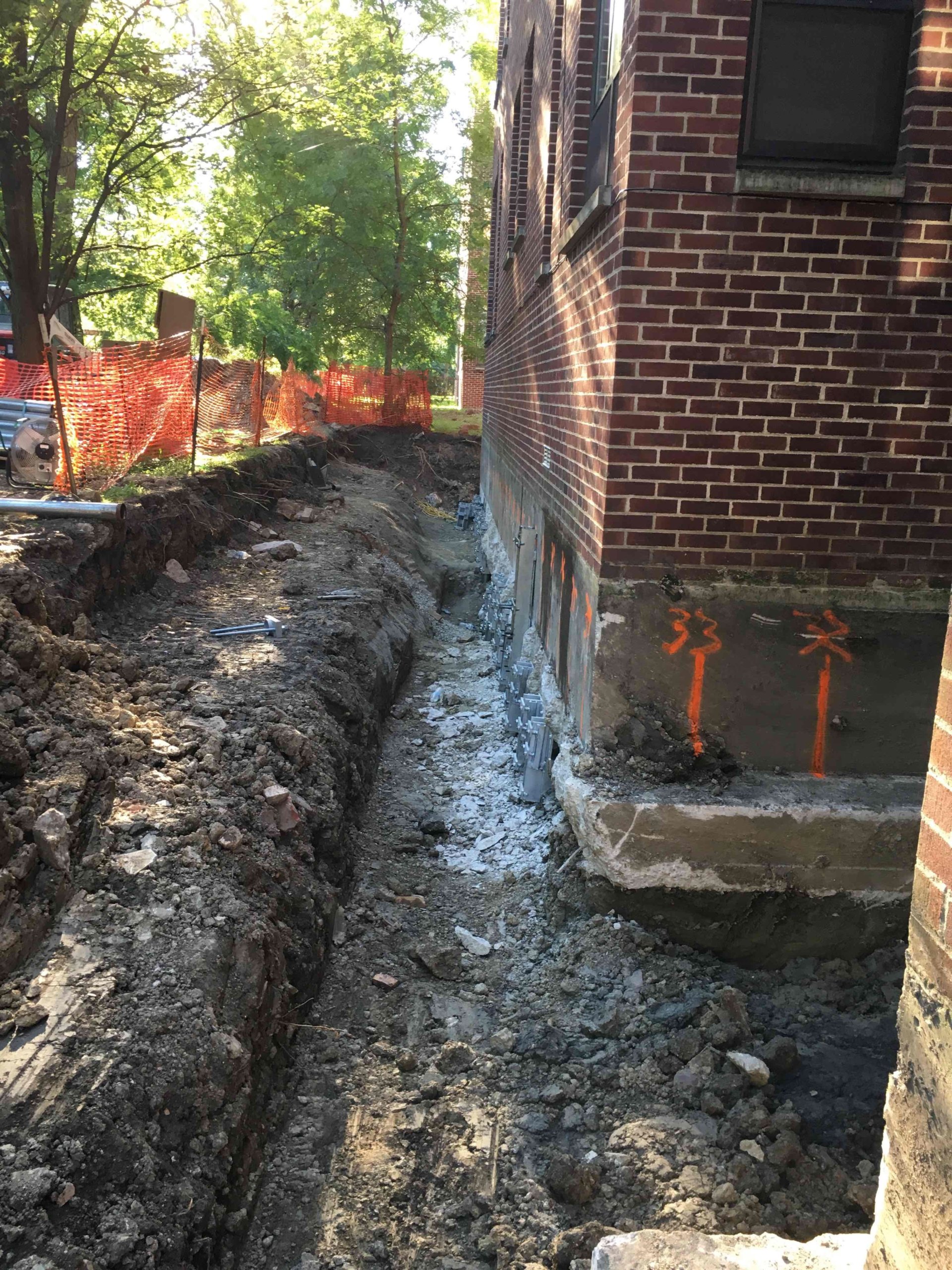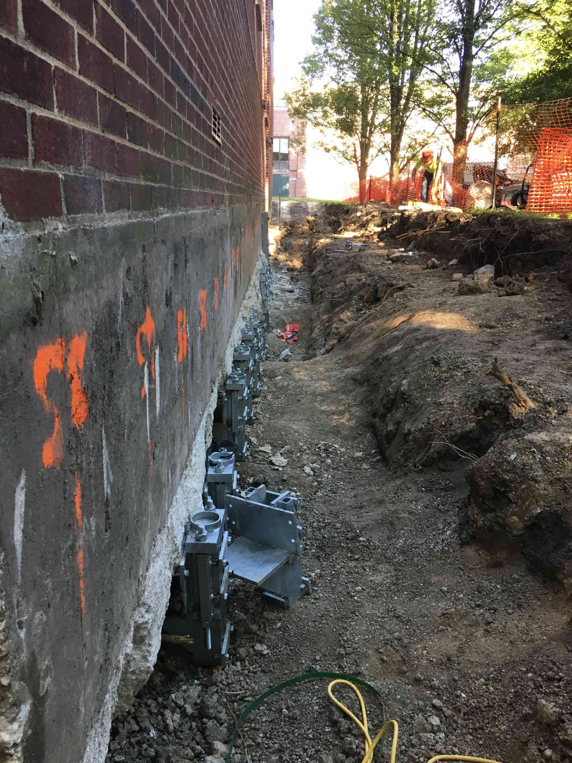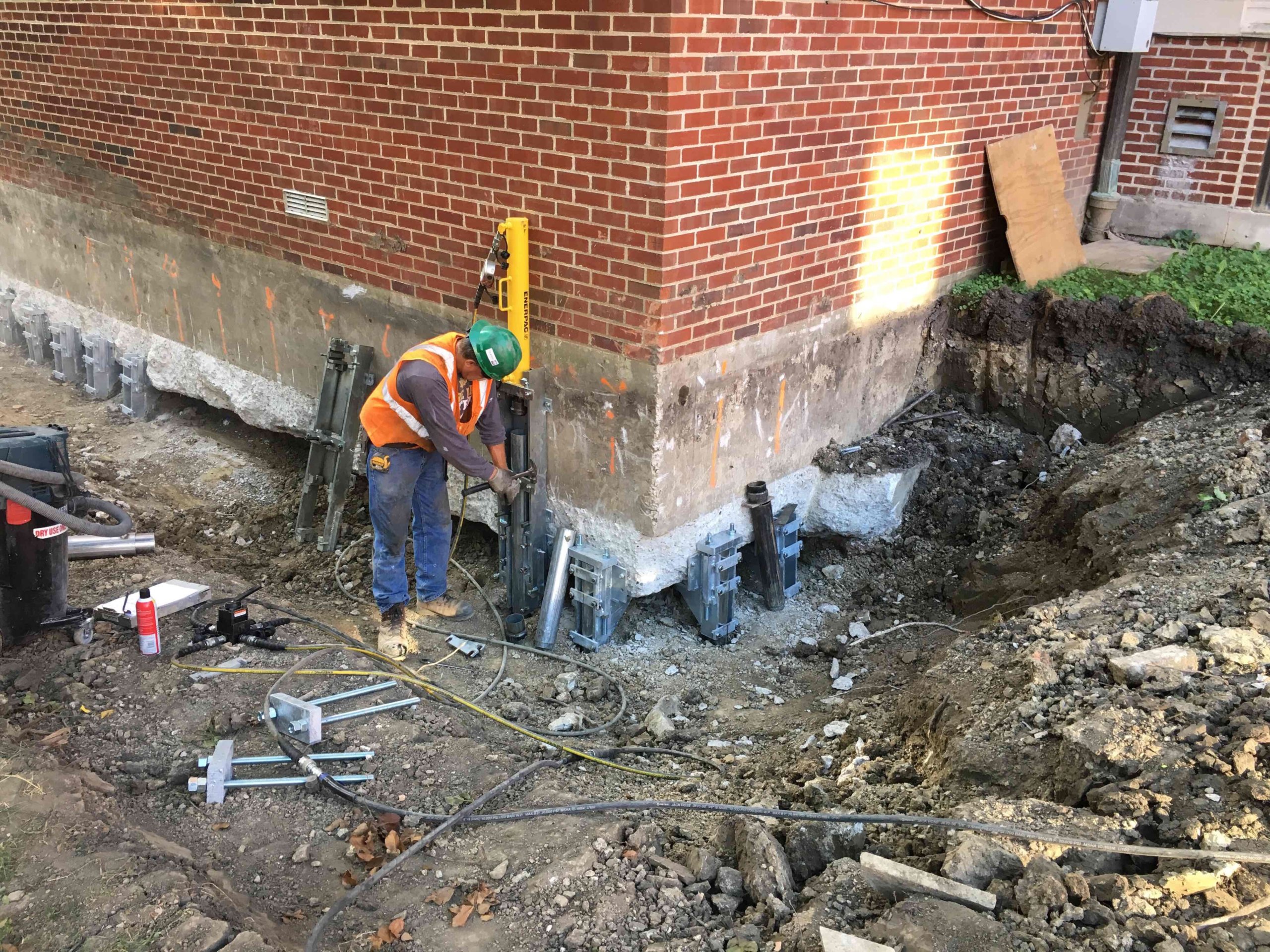 Stalworth installed 124 push piers to stop the settling of an elderly living facility. Stalworth broke out and dug below the existing concrete footing to install the piers. Piers were installed both outside the building and inside the interior crawl space, where a Vac truck was used to excavate to footing elevation.