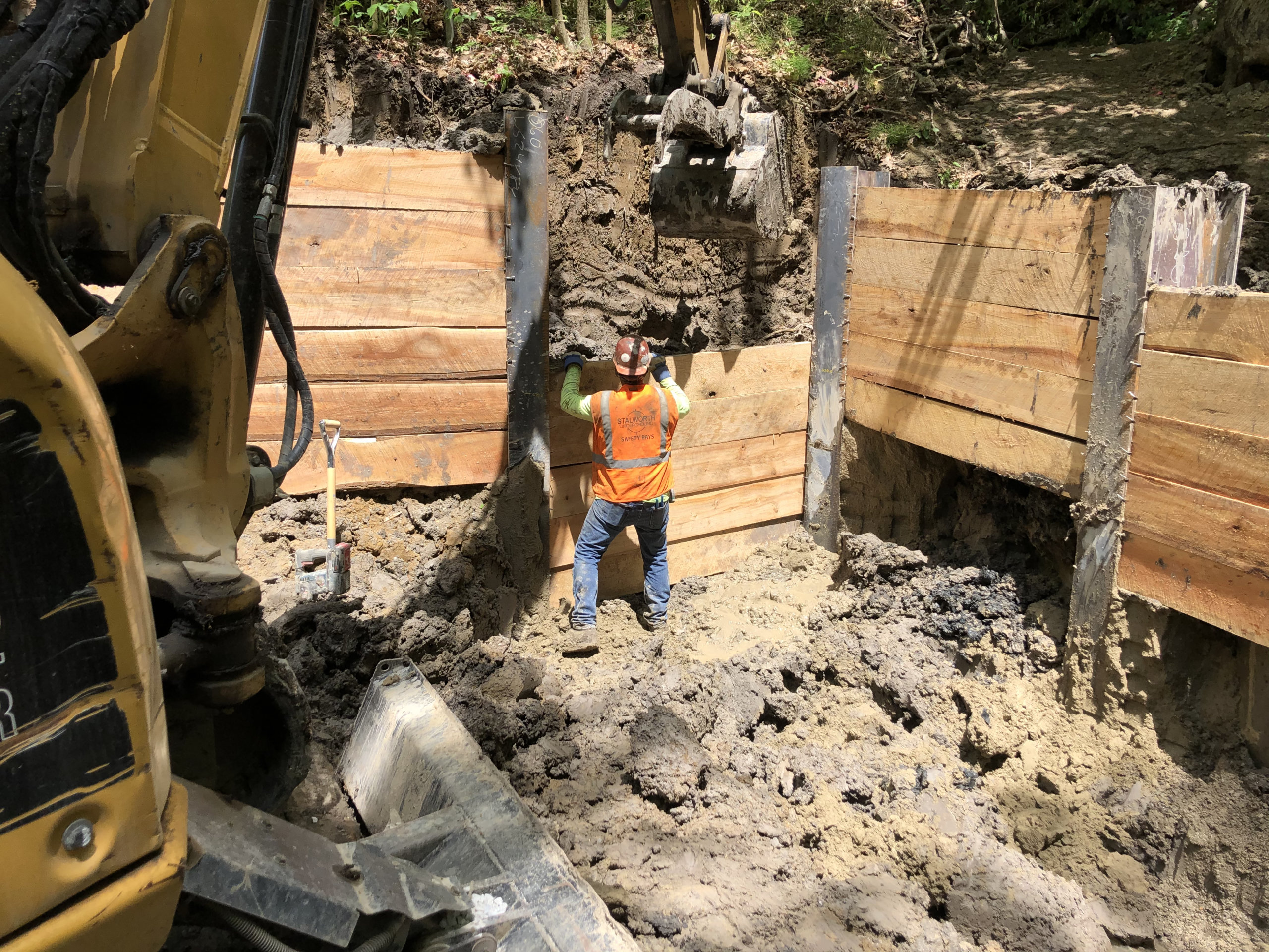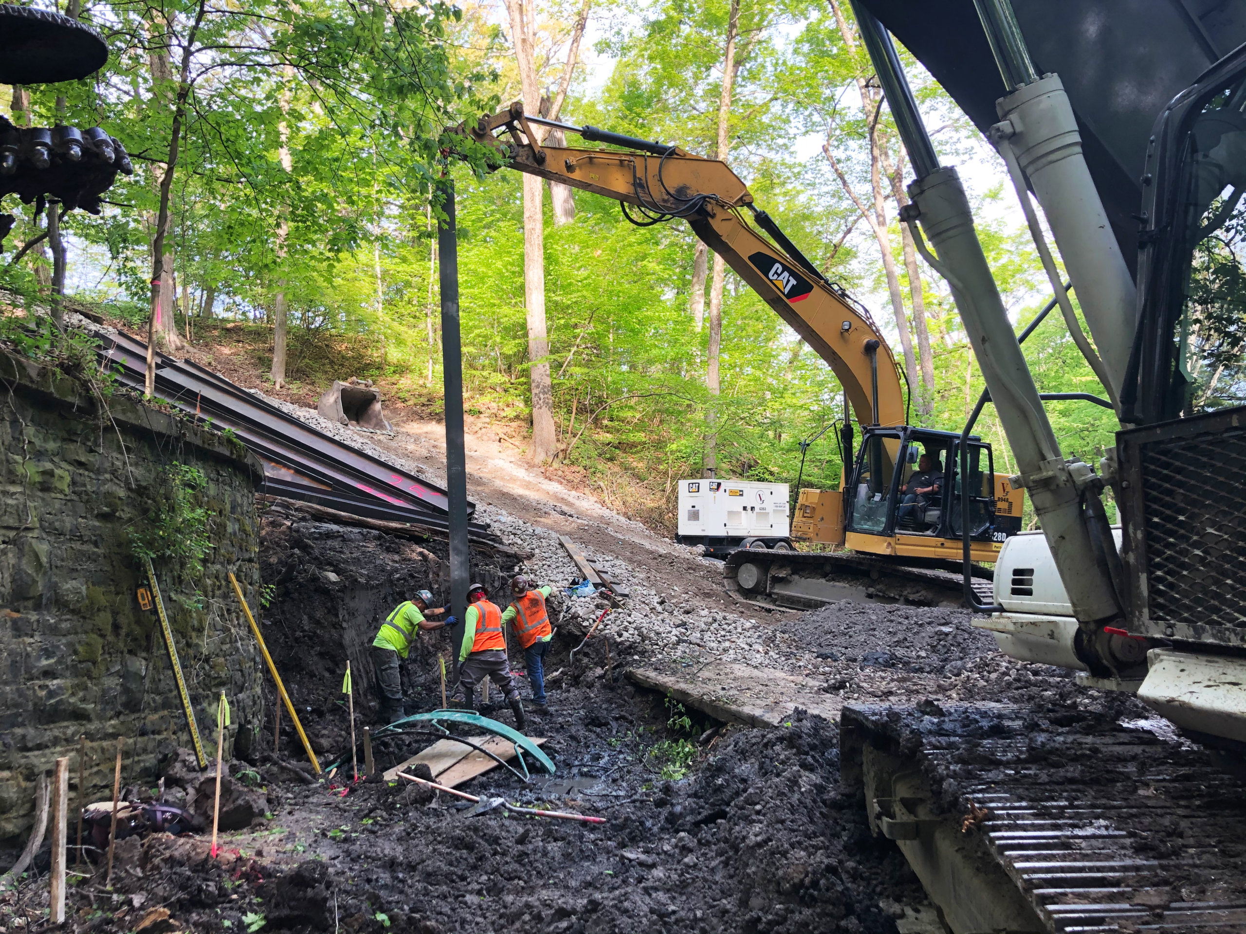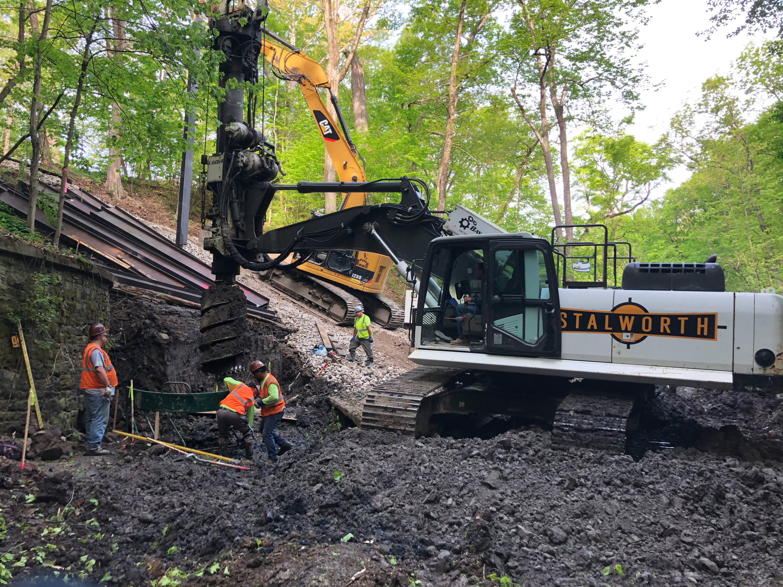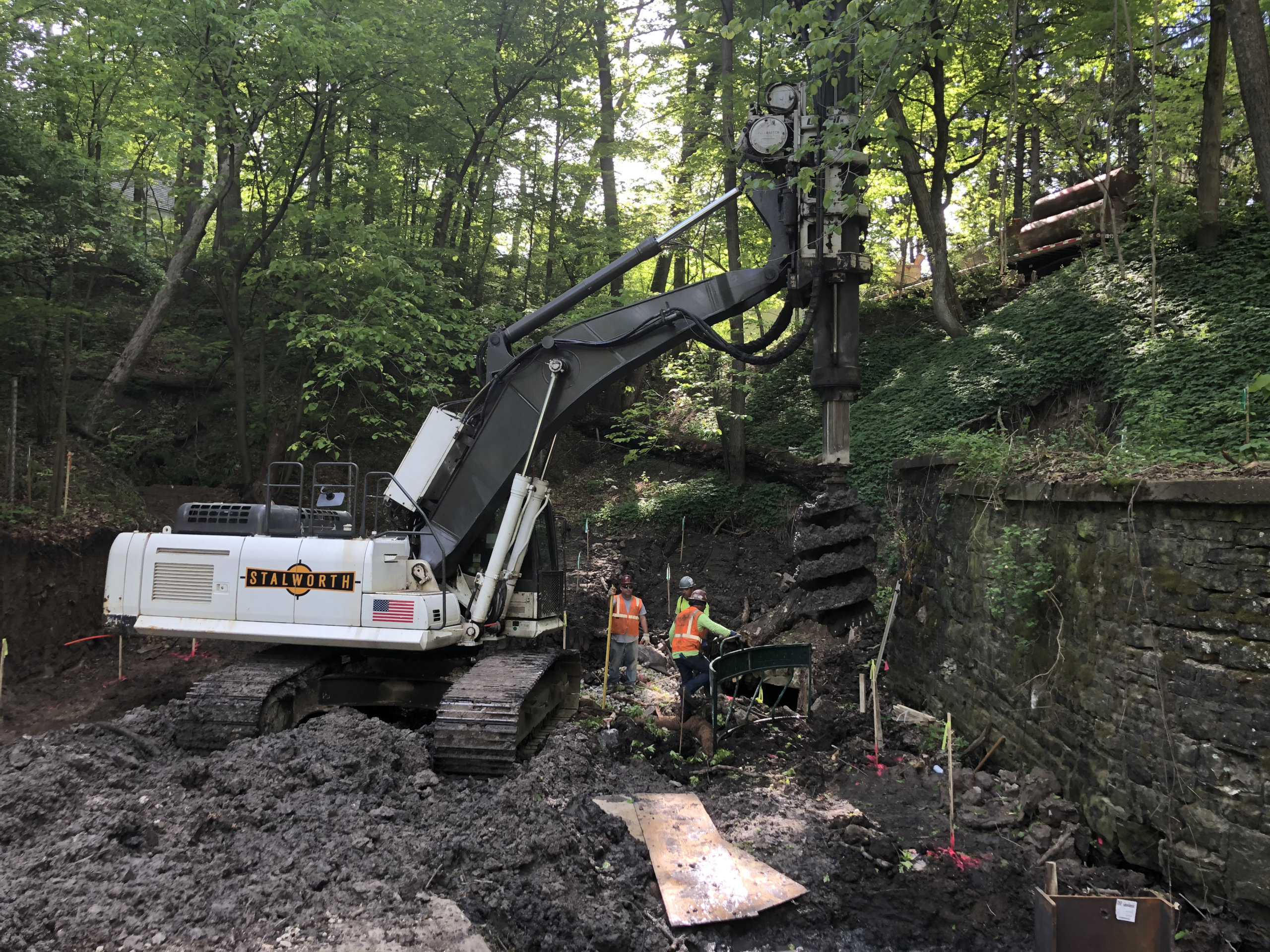 Stalworth was brought on this job to drill soldier piles to allow for the excavation and construction of a new culvert. The project was located down a steep ravine, which created some challenges accessing the job site and led to some unique solutions. One of which was using a pump truck and bucket at times to fill the shafts since the entrance was such a steep slope. In the end 15 soldier piles designed to handle a 13' cantilever cut were installed.