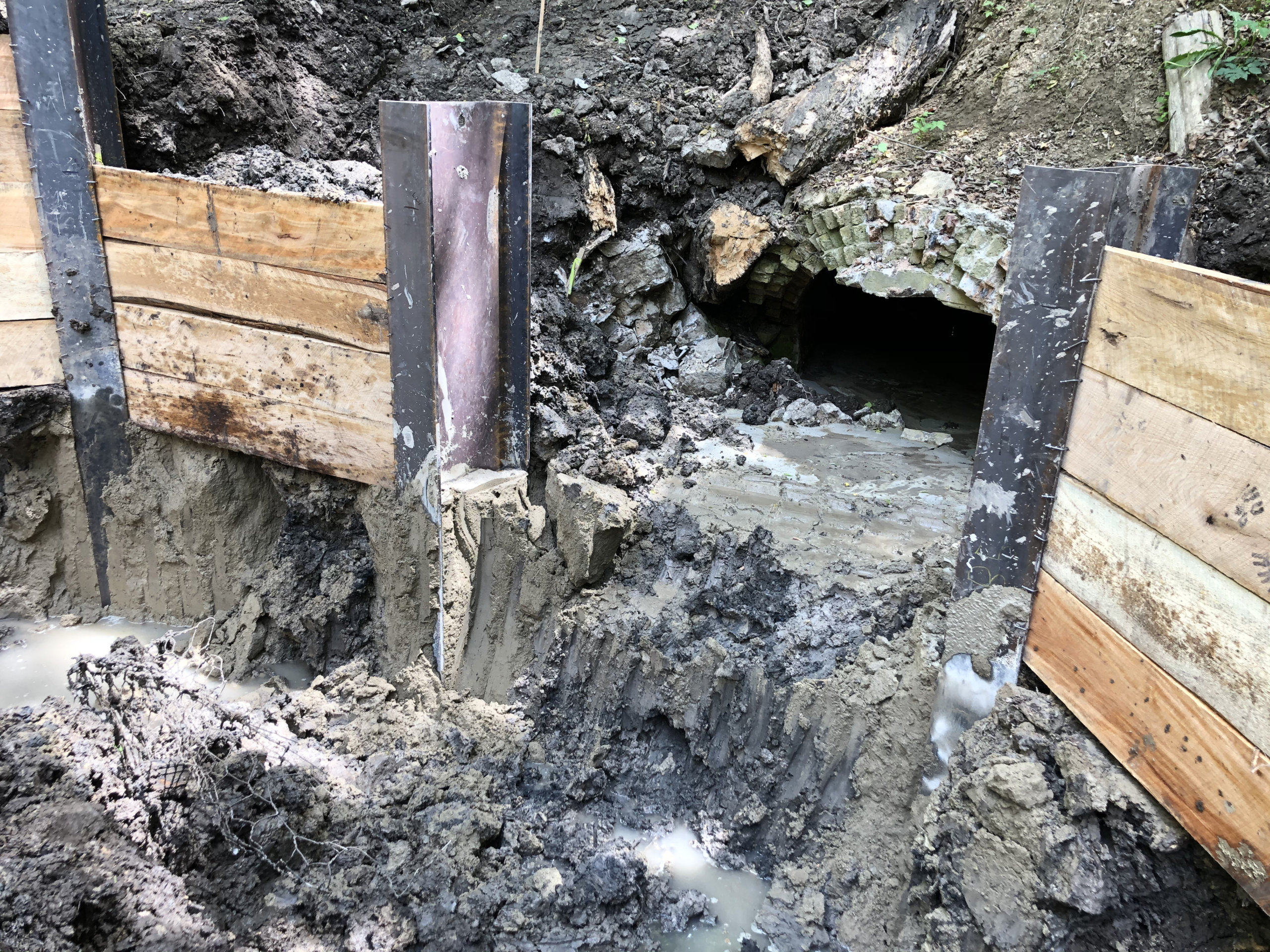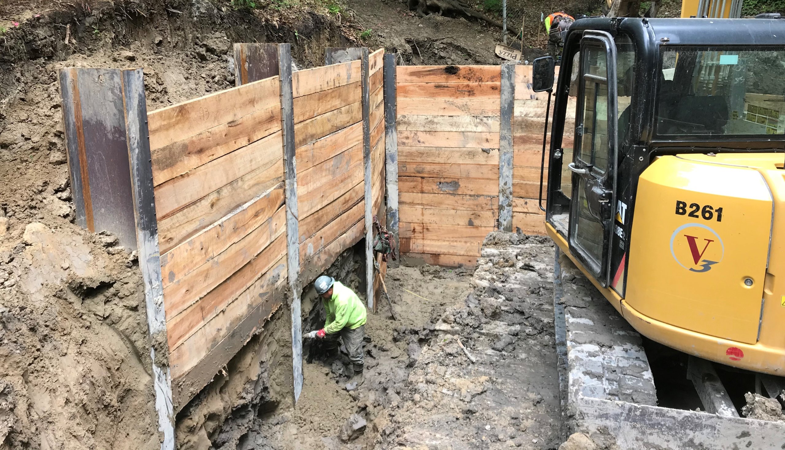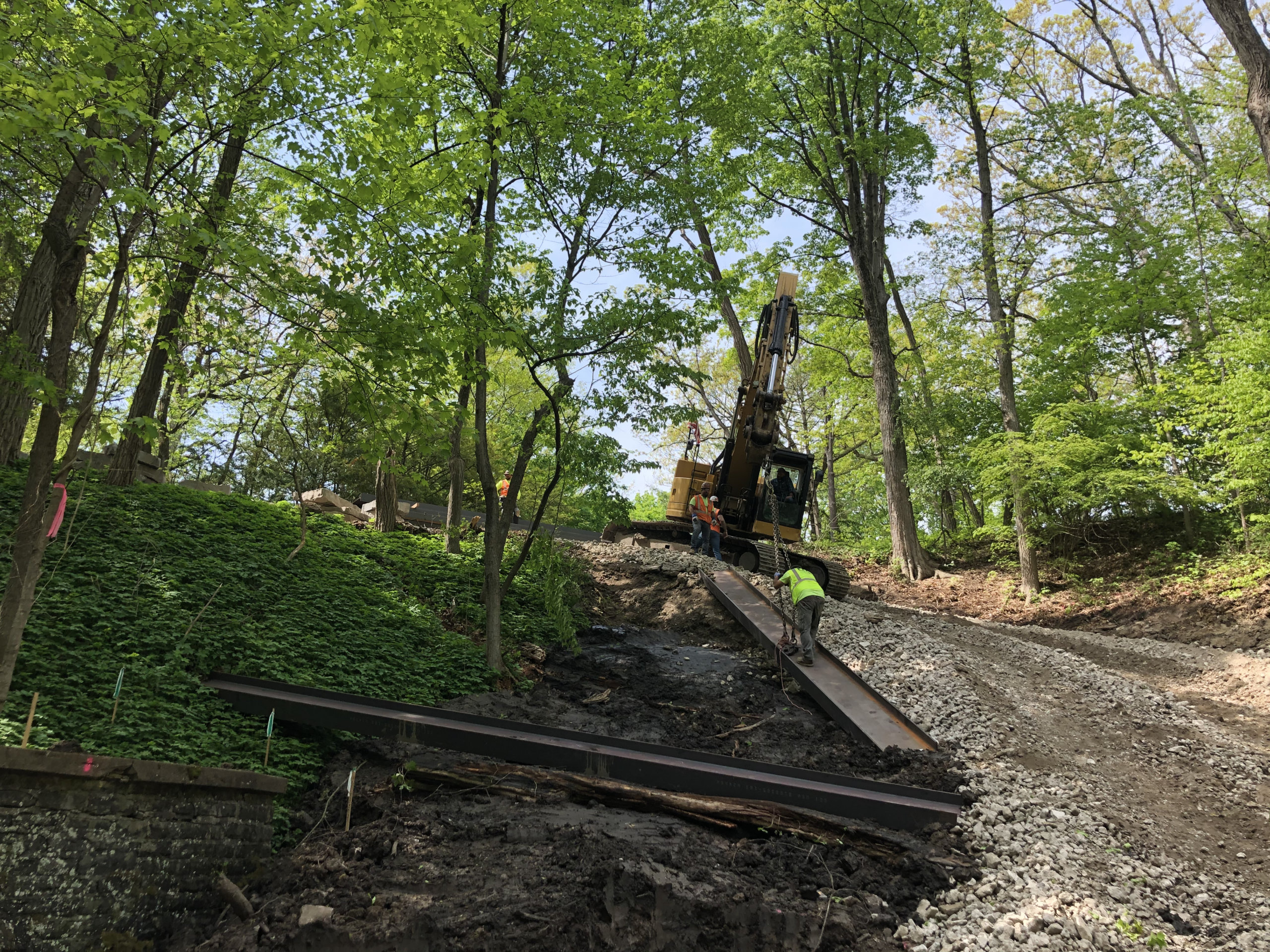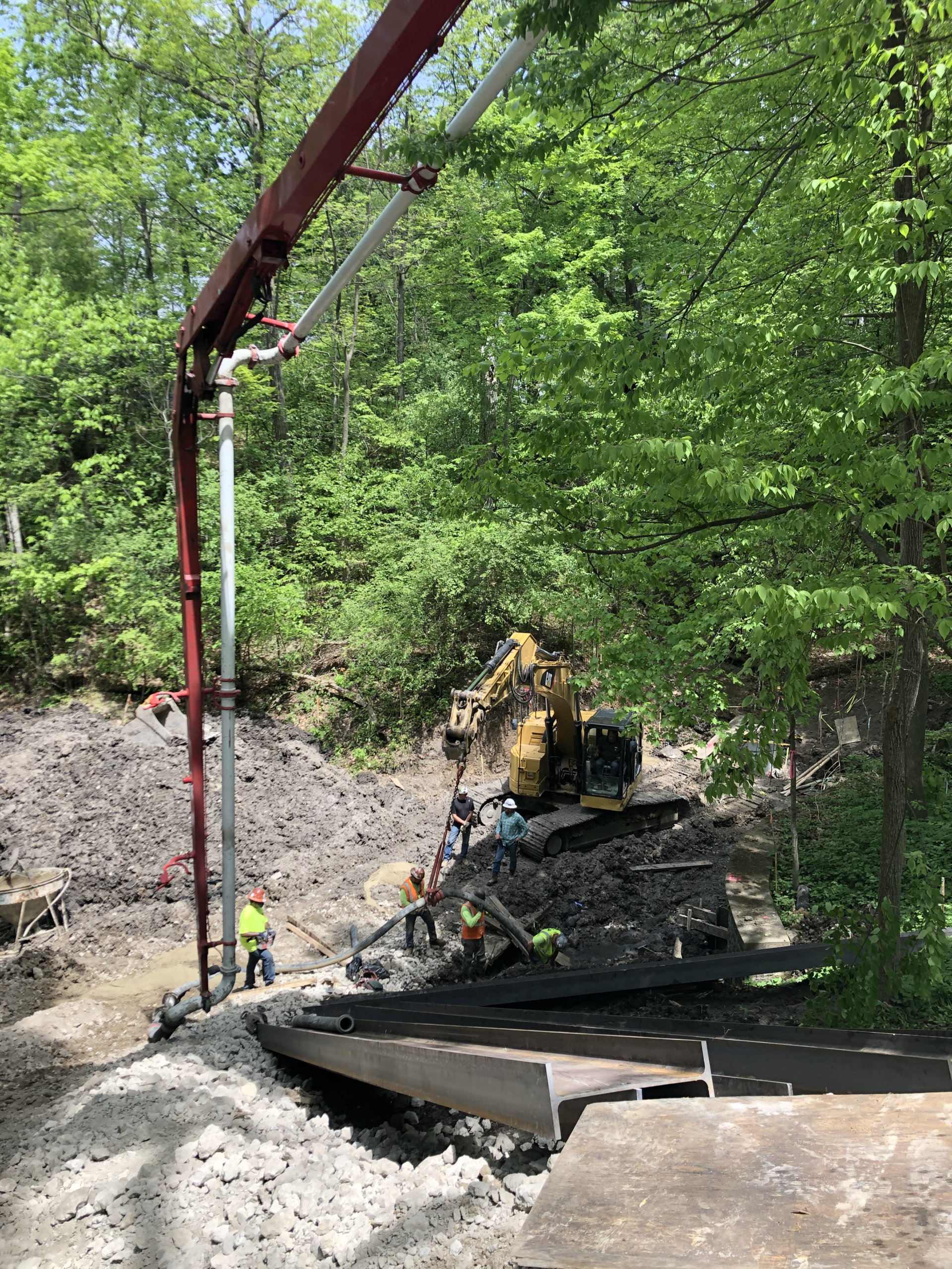 Stalworth was brought on this job to drill soldier piles to allow for the excavation and construction of a new culvert. The project was located down a steep ravine, which created some challenges accessing the job site and led to some unique solutions. One of which was using a pump truck and bucket at times to fill the shafts since the entrance was such a steep slope. In the end 15 soldier piles designed to handle a 13' cantilever cut were installed.