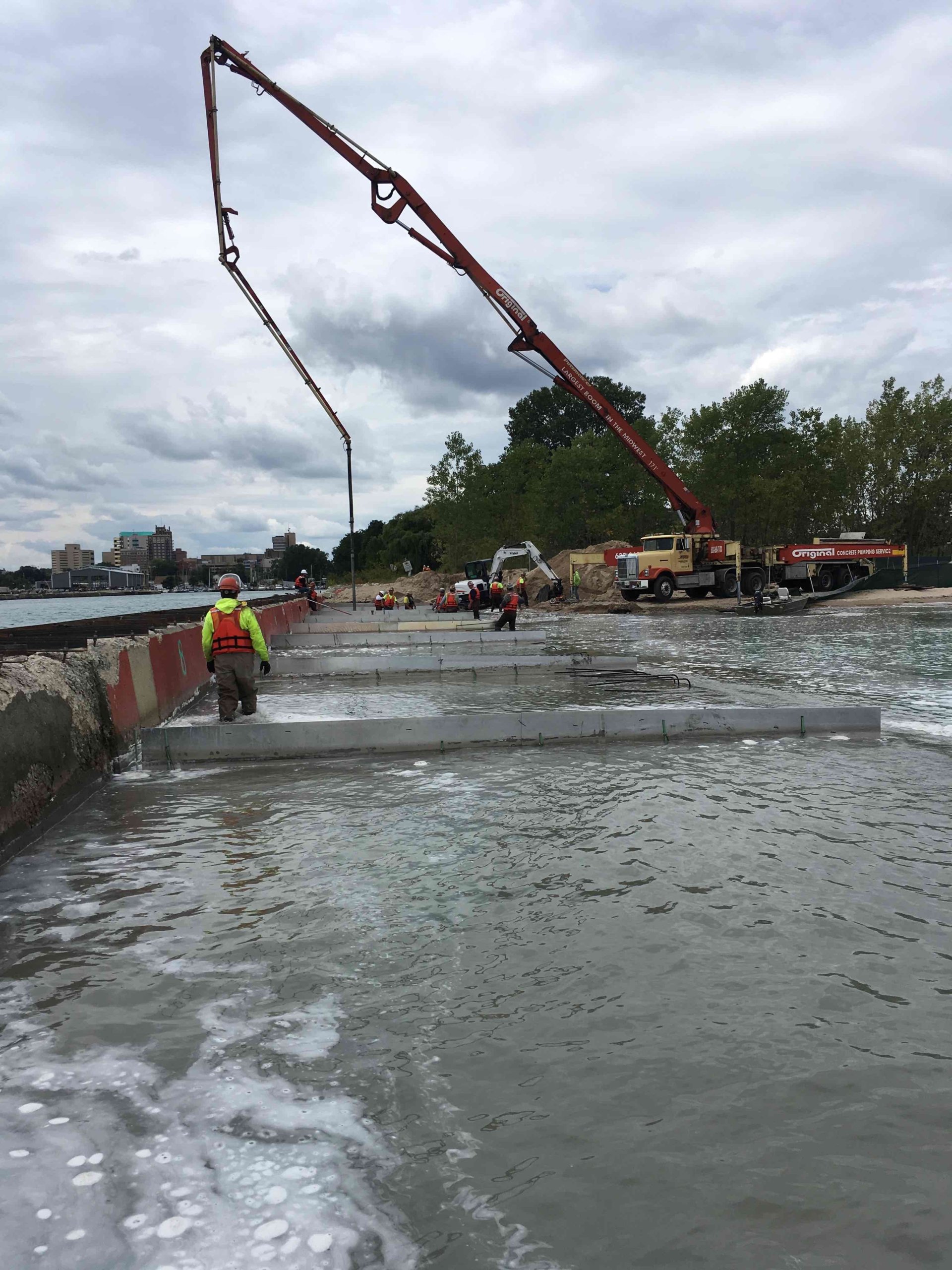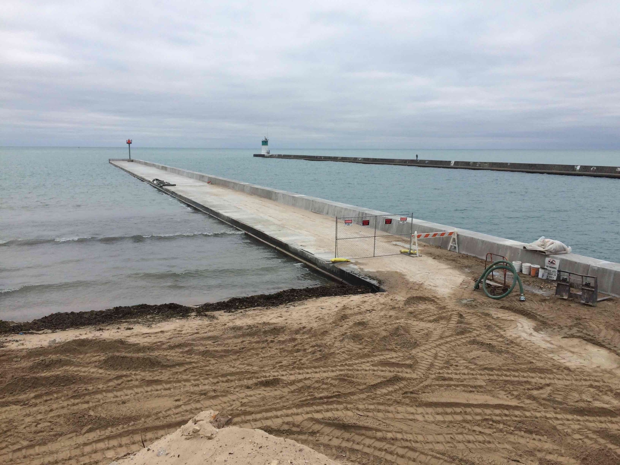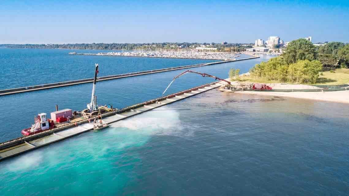Stalworth framed and poured 23 concrete slabs and parapet wall to replace a concrete pier into a harbor within Lake Michigan. The replaced harbor totalled nearly 650 LF. Stalworth tremmie poured concrete from a barge forming the new pier.